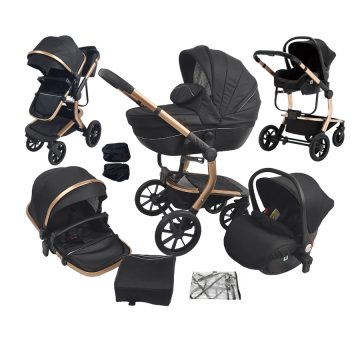 Carucioare 3 in 1 Negru contin: landou spatios, unitate sport, scoica auto 0 -13kg cu un design modern. Toate acestea vin montate separat pe cadru.